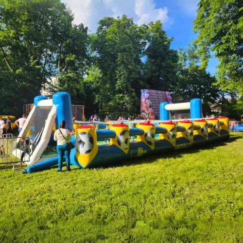Le baby-foot humain géant gonflable est une version grandeur nature du célèbre jeu de table. Ici, vous êtes les joueurs ! Chaque participant est attaché à une barre transversale et ne peut se déplacer que latéralement, exactement comme une figurine de baby-foot classique. L'objectif est simple : marquer plus de buts que l'équipe adverse dans le temps imparti.