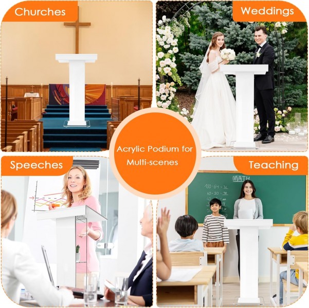 Pupitre en acrylique blanc, élégant et moderne, doté d’une large plateforme de lecture renforcée. Il comprend une étagère de rangement intégrée, idéale pour garder documents, accessoires ou matériel de présentation à portée de main. Sa structure stable en fait un support parfait pour églises, conférences, cérémonies, mariages, salles de classe et événements professionnels.