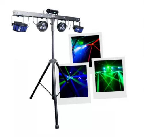 Pack de lumières comportant 2 Derby Beam LED, 2 PAR LED, 4 LED pour effet Strobe et UV et 1 LASER vert et rouge.